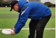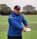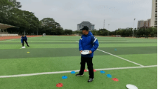 ②低位接法:蟹钳式接盘——在团队飞盘比赛中,当防守人和接盘人距离比较近时,要采用双手握接的接盘方式,保证在防守人防守到位之前接到飞盘,一般在飞盘低于腰部时使用。飞盘低于腰部时, 手掌向上,拇指在飞盘正面,注意力集中在飞盘上,冲刺跑向飞盘,不要减速。当双手碰触到飞盘时,用力握住飞盘,先保证将飞盘控制在手中,再考虑下一步的传盘动作。