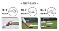 ③薄饼式接法:又称汉堡包接法,是最稳妥的接盘方式,也是初学者应该最先掌握的接盘动作,一般在飞盘飞向接盘人腰部以上、肩膀以下位置时采用这种接盘方法。