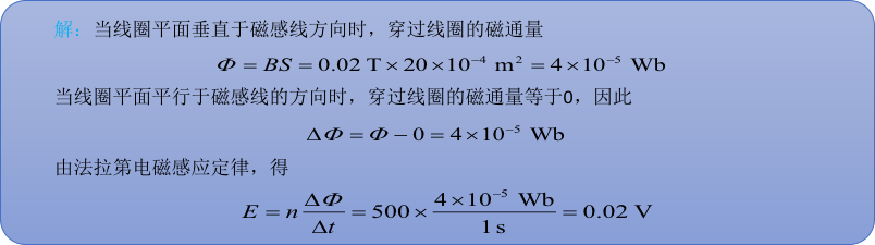 【例题】 一个面积为20 cm2,匝数为500匝的线圈,放入 B=0.02 T的匀强磁场中.在1 s内把线圈从平行于磁感线方向转90°变为与磁感线方向垂直,求感应电动势的平均值.