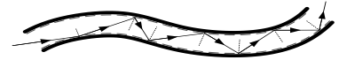 光纤是用纯度极高的石英拉制成的极细的丝,直径在几 μm到100 μm之间,由内芯和外套组成.由于内芯材料的折射率比外套的折射率大,光线在内芯和外套的界面上发生全反射,使得光在光纤中沿着纤芯传播,如图所示.光在内芯中的传播,几乎不发生散逸,因此光能损耗非常小.