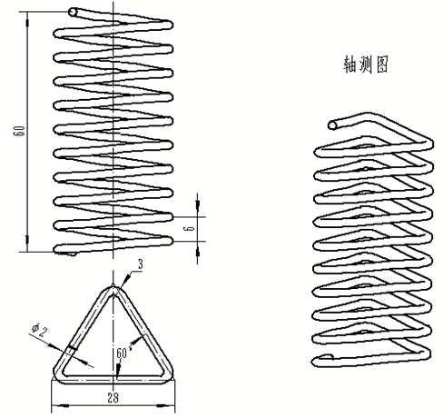 本任务通过二维工程图和轴测图的方式下达(未给出图框及标题栏),要求按如图所示中的尺寸完成三角形弹簧的三维建模(未注尺寸由Creo建模特性决定),并按图中轴测图的大致方位保存一个轴测图的视图方向,以便随时调用该轴测图。