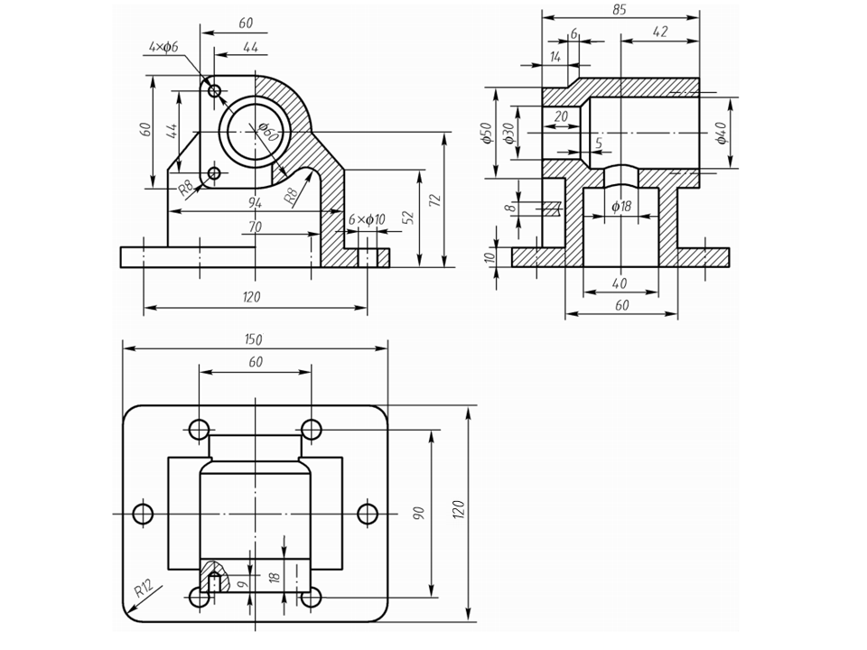 下面的建模任务仍然是根据工程图进行三维建模,主要考验学习者的工程图读图能力及建模能力,零件本身并不复杂,建模使用的命令也无太多技巧,所以前提是能读懂图纸。