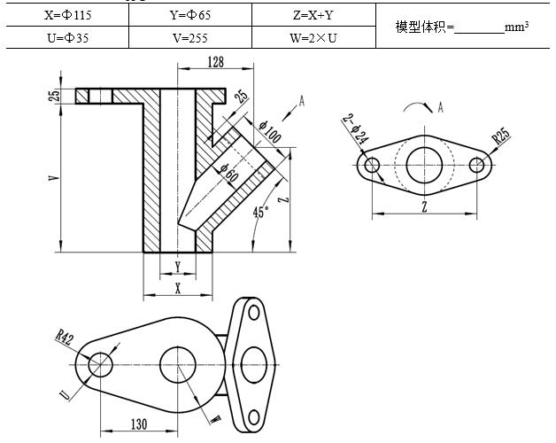 本任务通过二维工程图的方式下达(未给出图框及标题栏),与以前建模任务不同的是:该零件随时要根据客户的需要变更部分尺寸。现在要求按下表的尺寸并结合图中的其他尺寸完成斜面连接座的三维建模,同时回答模型体积大小,最后按50%透明度着色(紫色)显示三维模型,并另存为jpg格式的图片文件供客户查看建模效果。