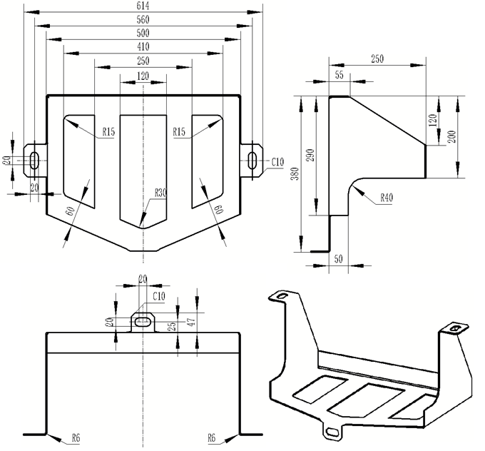 本任务通过二维工程图和轴测图的方式下达(未给出全部尺寸),要求按如图的尺寸和形状完成钣金支架的三维建模(壁厚均为3、未注圆角R3,其他未注尺寸由读者自行确定),并按图中轴测图的大致方位保存一个轴测图的视图方向,以便随时调用该轴测图。