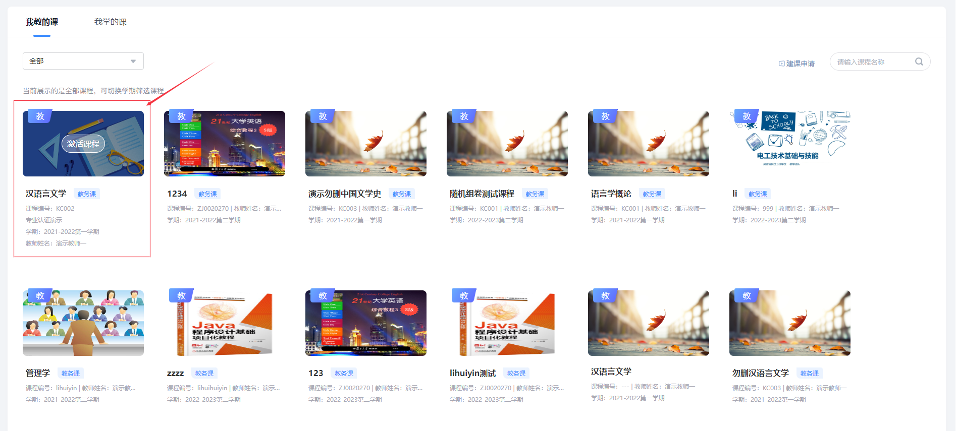 课程平台已与教务系统进行了数据对接工作,每学期教务系统开设的课程将会自动同步到课程平台下。在课程应用中,会带有“激活课程”按钮的是教务对接过来,还没有产生网络课程的课。