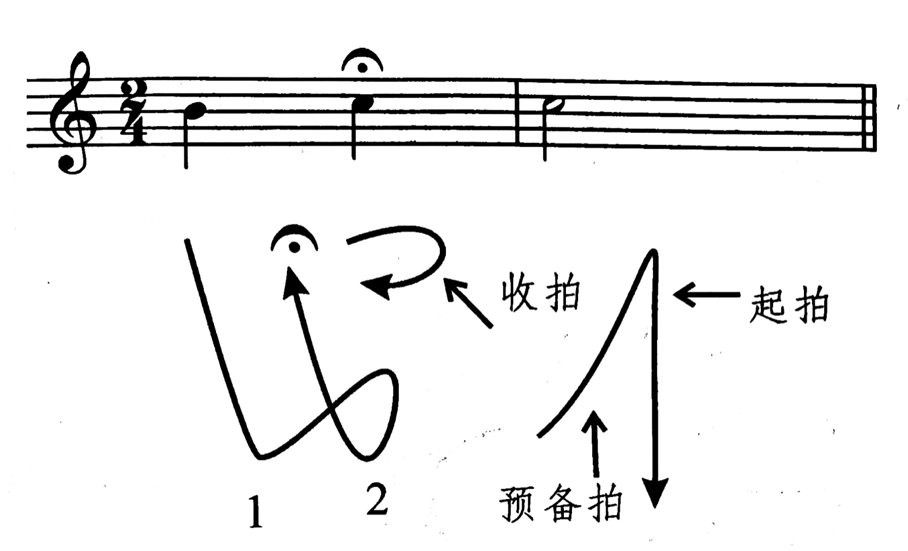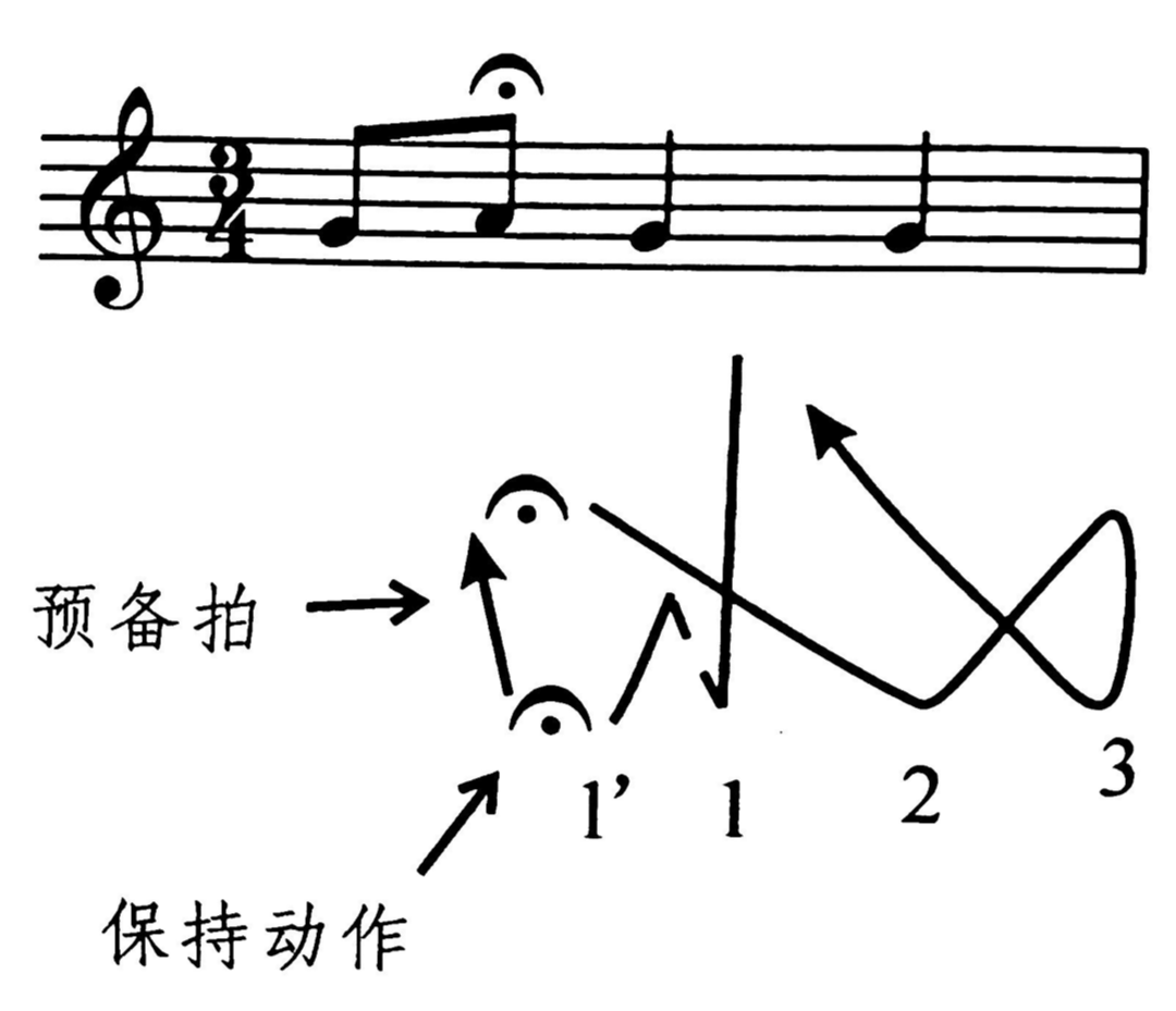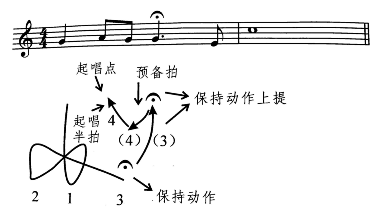 手击出拍点后,以保持动作提示延长,延长音结束时,手放松上提,该动作既表示延长音的结束,又是下面继唱的预备拍。