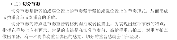 切分节奏的主要表现形式:重音在弱拍;在强拍上休止;延留音弱化强拍;拍号改变等。