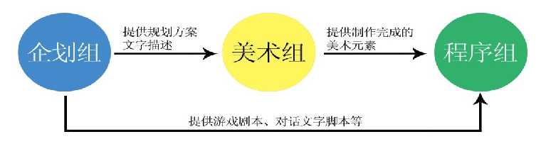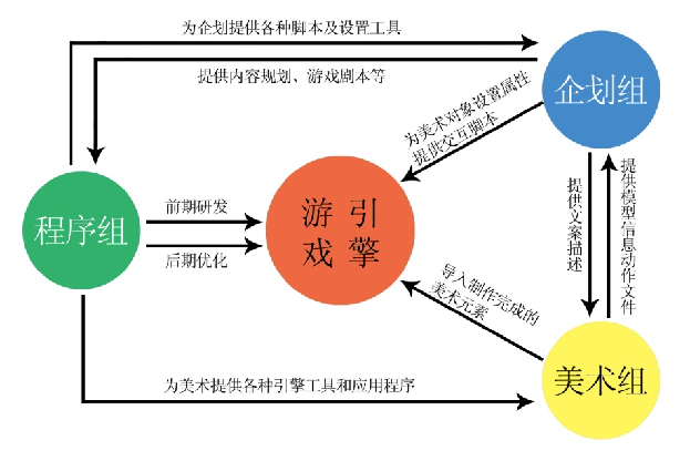在游戏引擎技术出现后,游戏研发团队中企划组、美术组、程序组三个部门的结构主体依然存在,但从工作流程来看三者早已摆脱了过去单一的线性结构,随着游戏引擎技术的引入,三个部门紧紧围绕着游戏引擎这个技术核心展开工作内容,除了三个部门之间相互协调配合外,他们同时要都要通过游戏引擎才能完成最终成品游戏的制作开发。