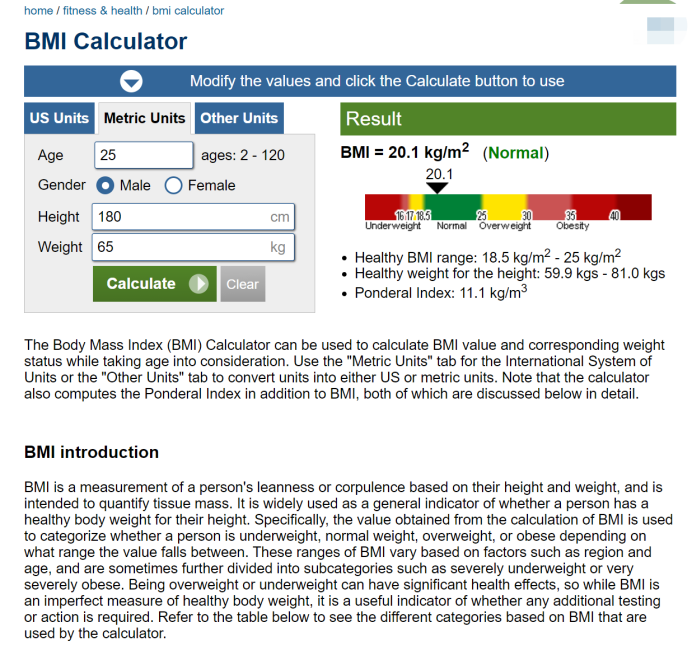 Read the web page (https://www.calculator.net/bmi-calculator.html). Then answer the questions orally.