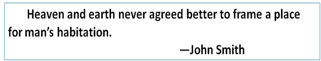 4. ‘Heaven and earth never agreed better to frame a place for man’s habitation.’ wrote John Smith (founder of the colony of Virginia) in praise of Virginia, the colony he helped found. As inviting as the climate were the native foods. The sea abounded in oysters and crabs, cod and lobster.