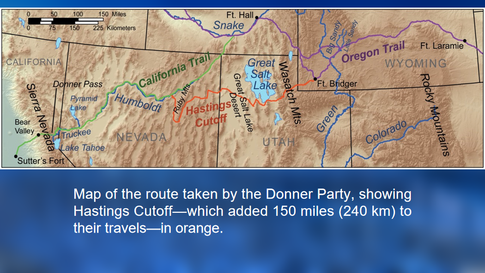 4. Twelve weeks after leaving Fort Bridger, the Donner Party reached the eastern Sierra Nevada Mountains and prepared to cross Truckee Pass, the last remaining barrier before they arrived in California’s Sacramento Valley. On October 31, they climbed the high Sierra ridges in an attempt to cross the pass, but five-foot high snow drifts blocked their path.