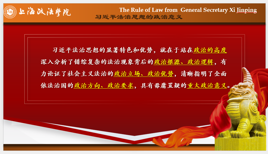 站在政治立场上分析法治问题,才能看清本质,习近平法治思想的显著特色和优势,就是站在政治的高度,深入分析了错综复杂的法治现象背后的政治根源、政治逻辑,有力论证了社会主义法治的政治立场、政治优势,清晰指明了全面依法治国的政治方向、政治要求,具有重大的政治意义。