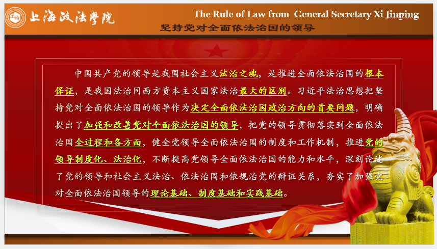 中国共产党的领导是我国社会主义法治之魂,是推进全面依法治国的根本保证,是我国法治同西方资本主义国家法治最大的区别。