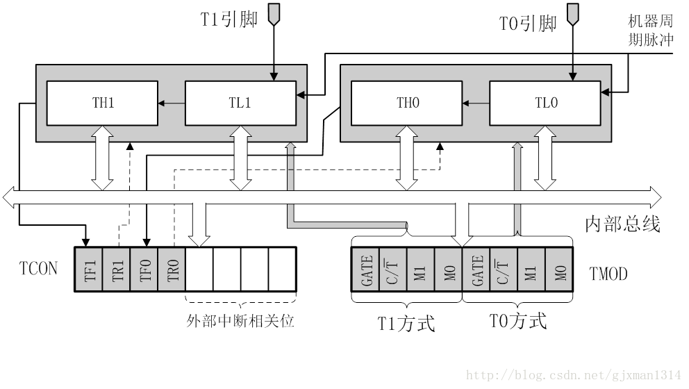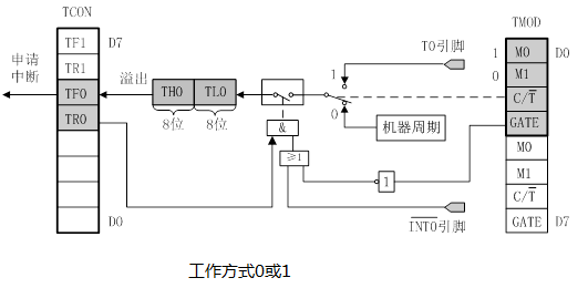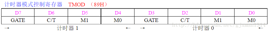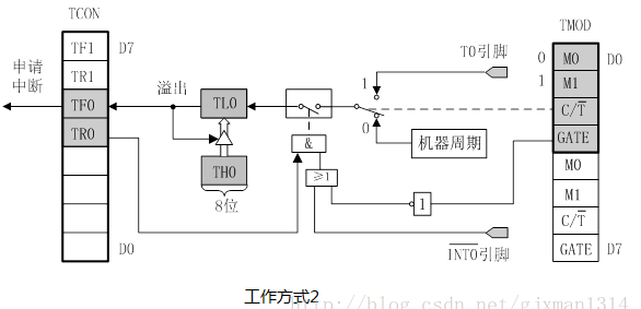 GATE :定时操作开关控制位,当GATE=1时,INT0或INT1引脚为高电平,同时TCON中的TR0或TR1控制位为1时,计时/计数器0或1才开始工作。若GATE=0,则只要将TR0或TR1控制位设为1,计时/计数器0或1就开始工作。