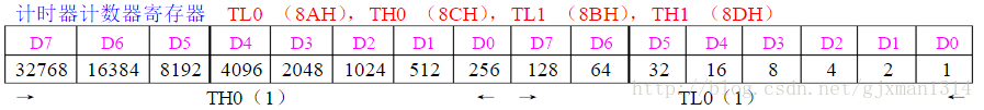 是定时计数器的核心,其中 TL0、TH0、是定时计数器0的底八位和高八位;TL1、TH1是定时计数器1的底八位和高八位;并且高八位和底八位可单独使用。16位加法计数器主要是在设置定时计数器的初值时候使用