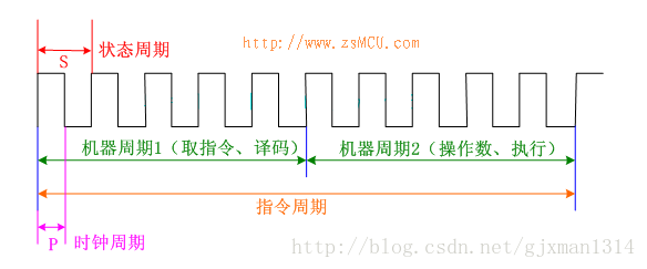 机器周期:在计算机中,为了便于管理,常把一条指令的执行过程划分为若干个阶段,每一阶段完成一项工作。8051系列单片机的一个机器周期同6个S周期(状态周期)组成。前面已说过一个时钟周期定义为一个节拍(用P表示),二个节拍定义为一个状态周期(用S表示),8051单片机的机器周期由6个状态周期组成,也就是说一个机器周期=6个状态周期=12个时钟周期。
