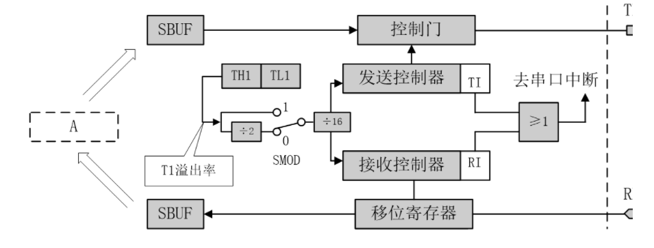 有两个物理上独立的接收、发送缓冲器SBUF,它们占用同一地址99H ;接收器是双缓冲结构 ;发送缓冲器,因为发送时CPU是主动的,不会生重叠错误。