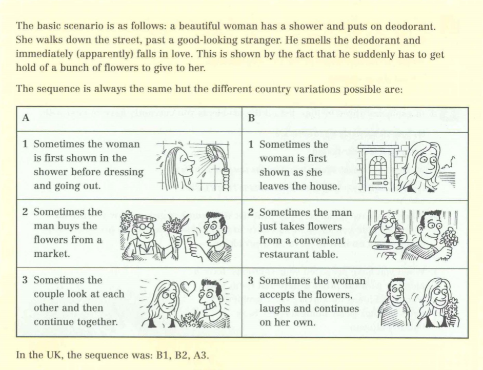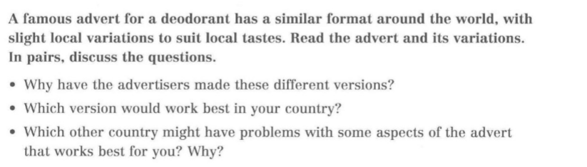Advertising tends to have to vary enormously from culture to culture so as to cater for the different cultural expectations of the diverse target audiences. Some companies operating globally try to follow a one-size-fits-all strategy and run exactly the same advertisements throughout the world. The occasionally misfires, as the true examples on our book page 92 activity 3 illustrate. A more successful approach is to develop a core theme with slight local adaptations: this approach is analysed in this section with the aim of discussing why one approach might be more suitable than another for a particular culture.