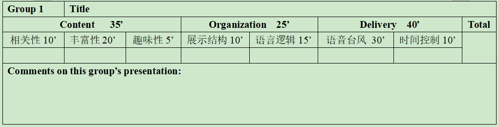 2.小组陈述的PPT要根据需要配上图表、图片或数据,可以有重点文字提示,不可以出现大段文字。注意:PPT背景、文字、图片要清晰可读,字体和字符大小要设置合理,以教室最后一排同学可见为准。每组的PPT需要在课前拷贝到教室电脑上。