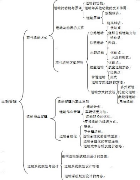 所包含知识点有:五种运输方式、各种运输方式的服务特性、影响运输方式的选择因素、选择运输路线、运输方式的发展(多式联运、托盘运输、集装箱运输)