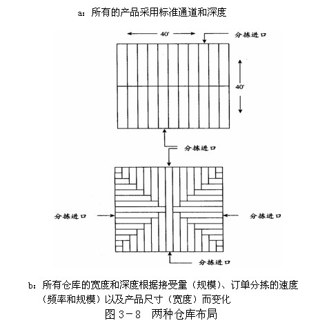 存货速度(用周转率来衡量),以及在最大程度上“直接送货”给客户(通过一个地区性仓库或者批发商的仓库),这两者也会对仓库规模具有较大影响。惠而浦公司开发了一个计算机程序来模拟这两个特征,以及它全部的渠道网络(包括批发分销商)所要求的存储空间(立方)。公司计算出它控制的每个工厂或每个批发商的仓库所需的平方尺数。然后在每种主要产品的基本存储空间要求的基础上增加空间,从而为通道和站台以及垂直和水平存储站中不用的(空闲的)部分提供场地。
