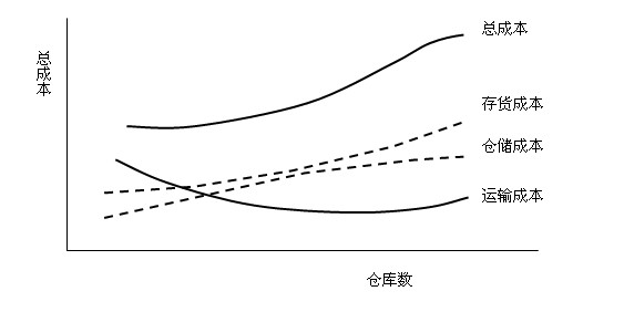 在决定仓库设施的数目问题上,有四个因素很重要:销售机会损失的成本、库存成本、仓储成本以及运输成本。图1说明了除了销售机会损失成本之外的其他成本因素。尽管销售机会的损失对公司来说至关重要,它却是最难计算和估计的,并且对于不同公司和行业来说都不一样。如果图1中有销售机会损失的成本,它通常向下滑动至右边。滑动的程度却变化不一。