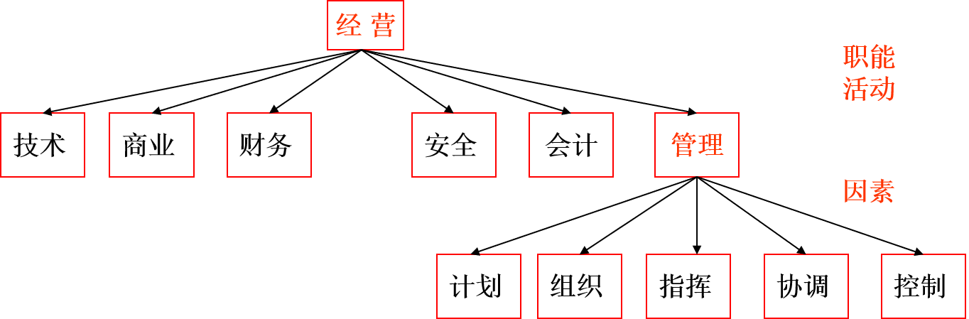 (1)技术活动(生产、制造、加工);(2)商业活动(购买、销售、交换);(3)财务活动(筹集和最适当地利用资本);(4)安全活动(保护财产和人员);(5)会计活动(财产清点、资产负债表、成本、统计等);(6)管理活动(计划、组织、指挥、协调和控制)。