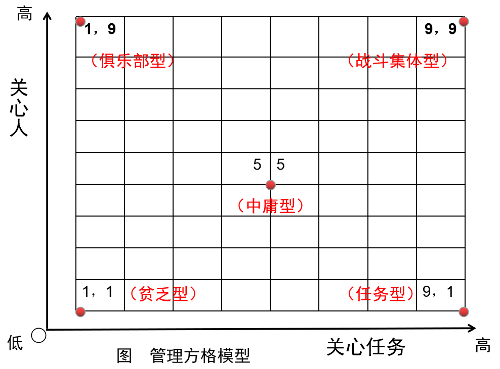其中,横轴表示领导者对工作任务的关心程度;纵轴表示领导者对人的关心程度。