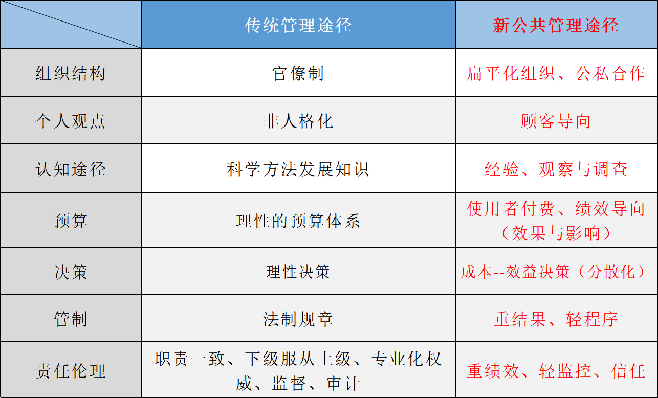 7.在行政责任与行政伦理方面,新公共管理途径与传统管理途径也截然不同。新公共管理寻求责任及伦理的方式是要求公共行政官员重新塑造一种彼此信任的文化。