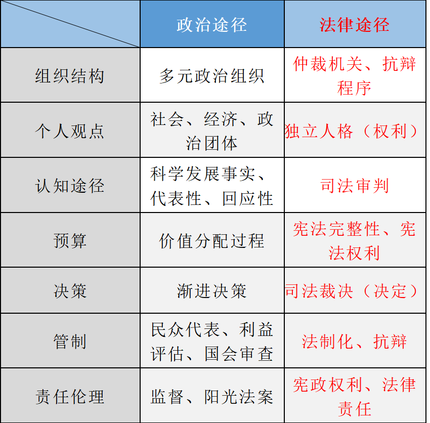 认知模式 | 理性-科学主义的 | 理论推理,经验观察,指标测量,实验 | 协议、民意、 政治争辩 | 归纳性的案例分析,演绎式的法律分析,反复辩论的程序 |
