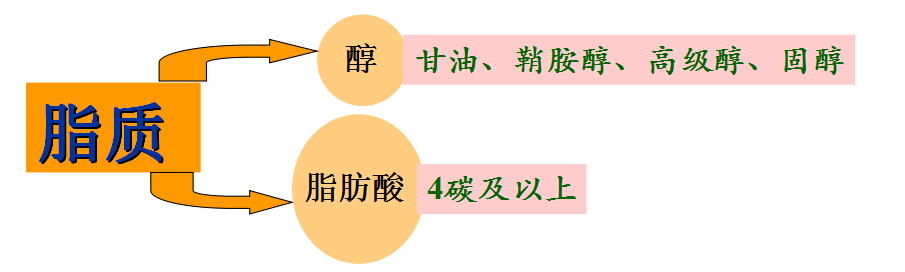 (1)磷脂:含磷酸、氮碱的单脂衍生物,分甘油醇磷酯、鞘氨醇磷脂;