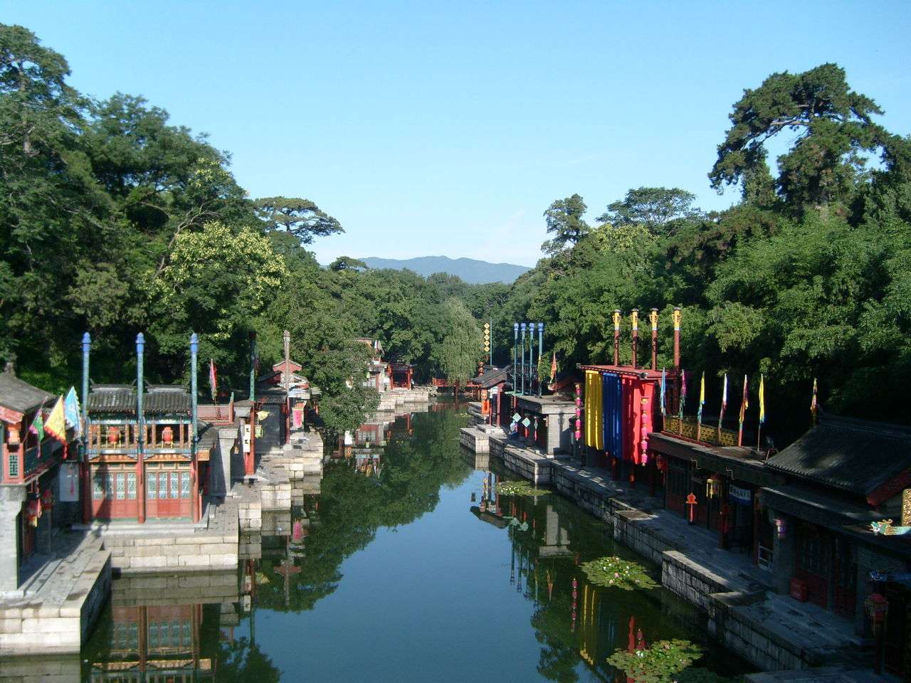 颐和园是中国最后一座皇家园林,也再现了许多江南的优美风光。园林本身仿照西湖建造,昆明湖上西堤的位置和走向都与西湖的苏堤相似,甚至也有“六桥”这样的景观;万寿山东麓的谐趣园仿照的是无锡寄畅园建造的,是一座园中之园,规模虽然不大,景色却很优美,它是在御苑中仿建江南园林最出色的例子;后湖区的“苏州街”仿照的是苏州、南京等地的沿河街市买卖街,更令人感觉来到了江南水乡的闹市。