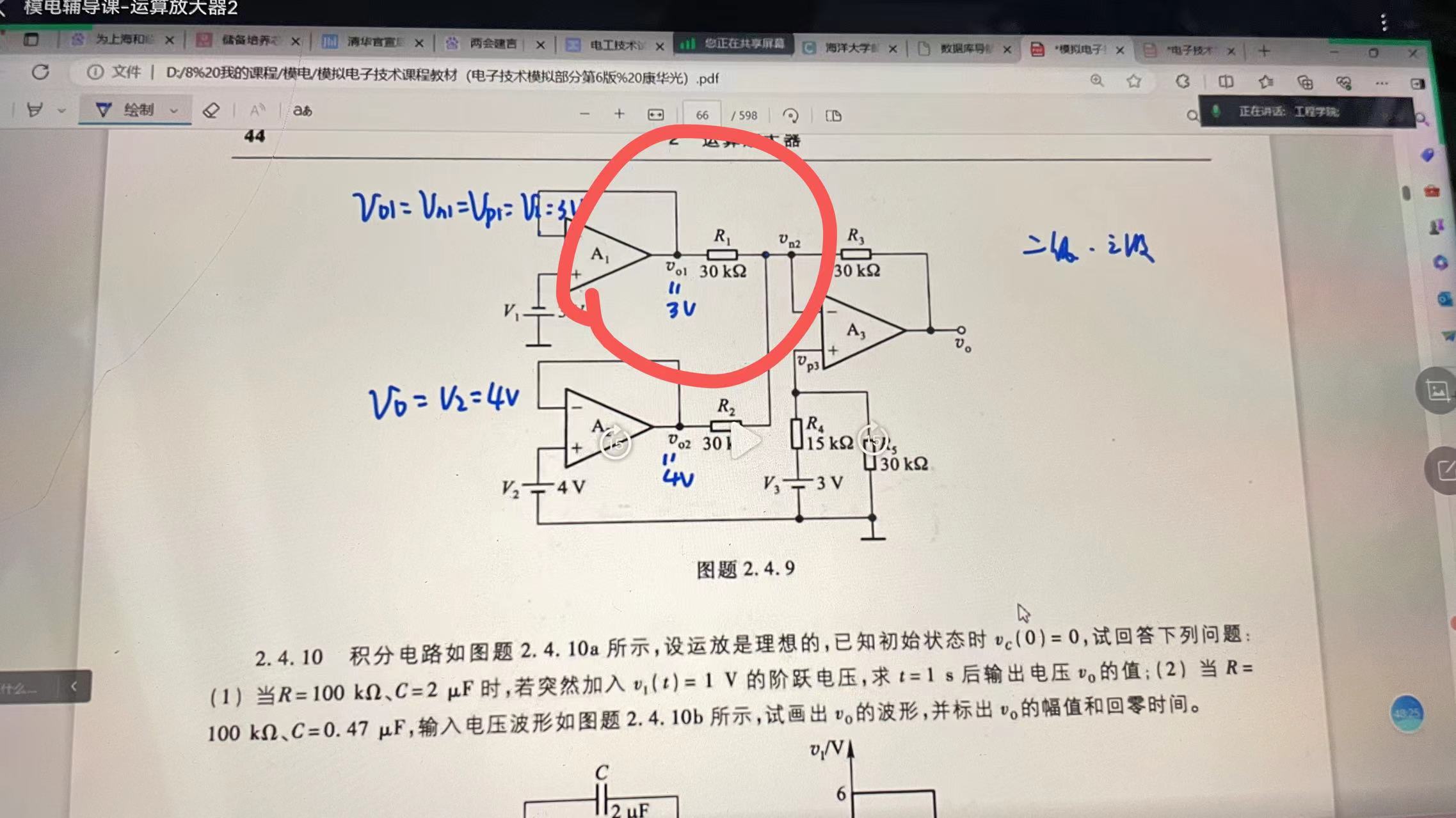 (1)题2.4.9中,输入电压V1电源为-3V,由于A1为电压跟随器,所以vo1=-3V,求解过程如下: