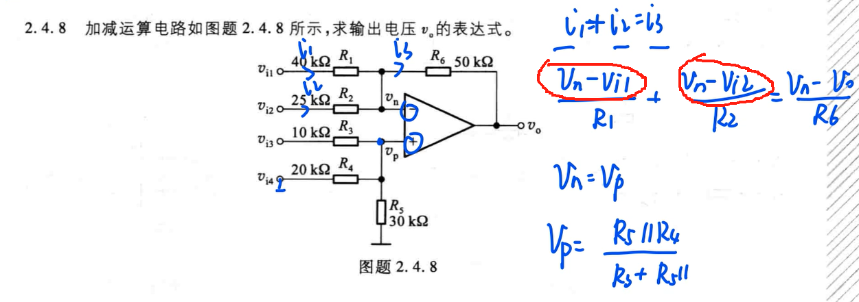 (2)题2.4.8,根据题中标注的电流参考方向,i1和i2电流的方向是从左到右,所以相应电阻上的电压应该是:vi1-vn,和 vi2-vn
