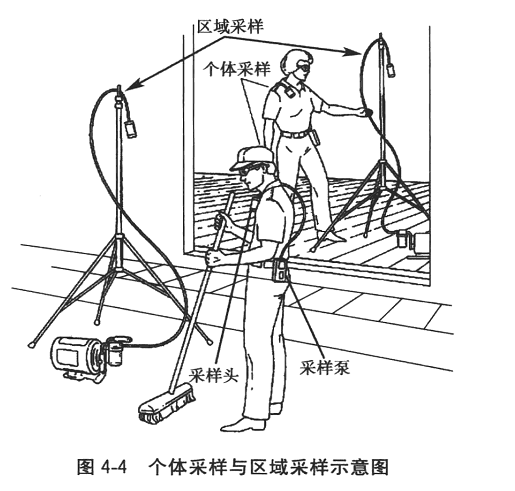 个体采样(personal sampling是将样品采集头置于作业者呼吸带内,可以用采样动力或不用采样动力(被动扩散)。通常采样仪直接佩戴在作业者身上。如采样仪器由检测人员携带,则应与作业者同行,此方法又名呼吸带跟踪采样(breathingzone sampling)。个体采样紧紧围绕作业工人,是反映工人接触水平的最佳方式——可较精确地测量一个工作日工人接触有害物质的日平均浓度,即时间加权平均容许浓度(TWA)。个体采样对采样动力要求较高,需要能较长时间工作且流量要非常稳定的个体采定点区域采样(area sampling是将采样仪固定在工作场所某一区域,是该区域环境质量的直接反映。由于采样系统固定,未考虑作业者的流行性,定点区域采样难以反映作业者的真实接触水平。以往经验表明,定点区域采样结果与个体采样结果并不一致,两者之间并无明显的联系。但可以结合工时法,记录作业者在每一采样区域的停留时间,再结合定点区域采样结果,估算作业者接触水平。