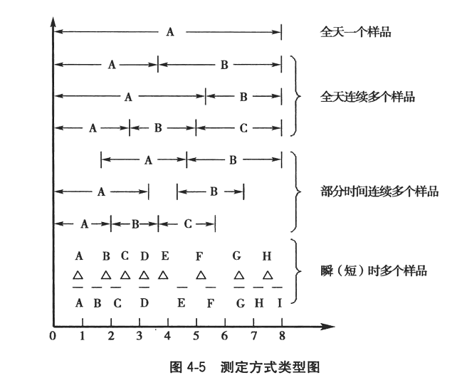 部分时间连续多个样品测量,主要问题是对未采取的时间怎样处理,严格讲测得的结果仅代表采样时间的浓度水平。尽管通过统计学处理方法推断非采样时间的浓度变化,但要保证这一推断恰当合理,采样时间应超过工作时间的70%~80%,例如每天工作8h,采样至少需要6h。