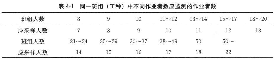 1.个体采样(personal sampling  同一车间若有许多工种,则每一工种的操作工都要监测。作业者使在同一个班组或工种作业,受作业者作业习惯、不同作业点停留时间等影响,不同个体间接触水平差异仍然较大。为了能代表一个班组的作业者的接触水平,同一工种若有许多作业者,应随机地选择部分作业者作为采样对象,最好是全部作业者。若班组人数少于8人,应每人都要采样;若班组人数多于8人,则根据下表确定应采样人数(表4-1)。如遵照执行,从数理统计角度考虑可保证能检出最高水平接触。表4-1要求较国家颁布的《工作场所空气中有害物质监测的采样规范》更加严格。规范根据实际工作情形,依据简单、可行的原则,要求的采样人数没有如此多。