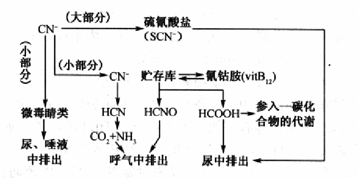 氰化氢主要经呼吸道吸入;高浓度蒸气和氢氰酸液体可直接经皮肤吸收;氰氢酸也可经消化道吸收。进入体内的氰化氢,部分以原形经呼吸道随呼气排出,大部分在硫氰酸酶的作用下,与胱氨酸、半胱氨酸、谷胱甘肽等巯基化合物结合,转化为无毒的硫氰酸盐,保留于细胞外液中,最后随尿排出。但此过程可被硫氰酸氧化酶缓慢逆转,故在解毒早期,偶可见到中毒症状的复现。其中少部分转化为CO2和NH3,还可生成氰钴胺参与维生素B12的代谢。氰基可转化为甲酸盐,进一步参与一碳单位的代谢过程,如图示。