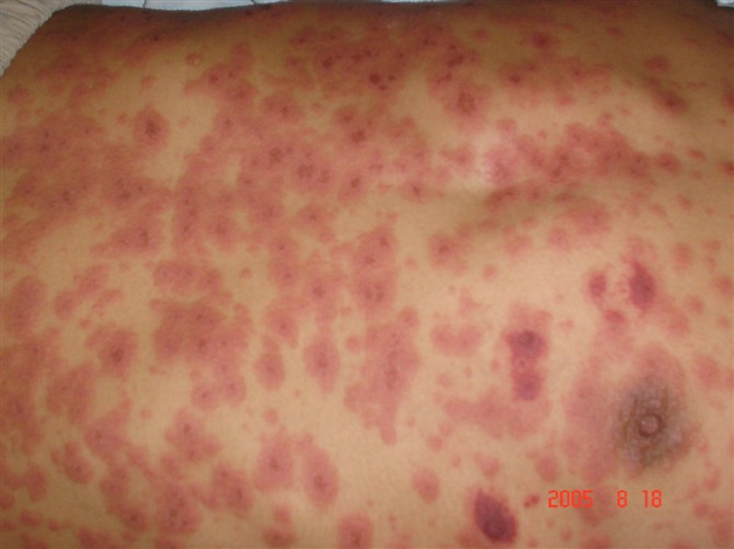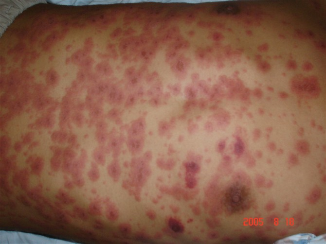 三氯乙烯中毒(躯干皮肤红色斑丘疹) 三氯乙烯中毒(躯干皮肤红色斑丘疹)