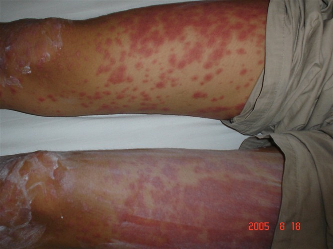 三氯乙烯中毒(下肢皮肤红色斑丘疹) 三氯乙烯中毒(背部皮肤红色斑丘疹)