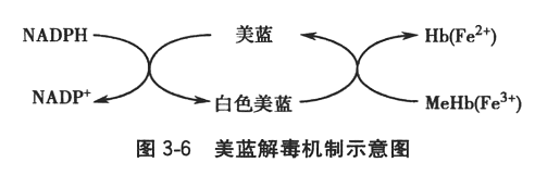 亚甲兰作为还原剂可促进MetHb还原,其作用机制是亚甲兰能作为中间电子传递体加快正常红细胞MetHb的酶还原系统的作用速度,促进NADPH还原MetHb(图3-6)。