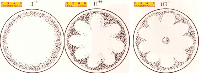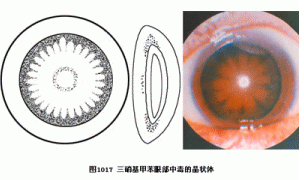 (2)晶体损害表现:慢性中毒患者出现晶体损害即中毒性白内障是常见而且具有特征性的体征。TNT中毒性白内障常开始于双眼晶状体周边部呈环形混浊,环多数为尖向内,底向外的楔形混浊融合而成,进一步晶体中央部出现盘状混浊。TNT白内障有如下特点:①一般接触TNT工龄在6个月至3年时可发生白内障。工龄越长发病率越高,10年以上工龄者发病率78.5%,15年以上高达83.65%;②白内障形成后,即使不再接触TNT,仍可进展或加重,脱离接触时未发现白内障的工人在数年后仍可发生;③一般不影响视力,但晶体中央部出现混浊,可使视力下降;④TNT白内障与TNT中毒性肝病发病不平行,中毒性白内障患者可伴有肝大,但亦可在无肝损伤情况下单独存在。