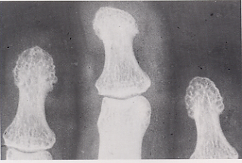 (3)肢端溶骨症(acroosteolysis,AOL):多发生于工龄较长的清釜工,发病工龄最短者仅一年。早期表现为雷诺综合征:手指麻木、疼痛、肿胀、变白或发绀等。随后逐渐出现末节指骨骨质溶解性损害。X线常见一指或多指末节指骨粗隆边缘呈半月状缺损,伴有骨皮质硬化,最后发展至指骨变粗变短,外形似鼓槌(杵状指)。手指动脉造影可见管腔狭窄、部分或全部阻塞。局部皮肤(手及前臂)局限性增厚、僵硬,呈硬皮病样损害,活动受限。目前认为,肢端溶骨症是氯乙烯所致全身性改变在指端局部的一种表现。肢端溶骨症的发生常伴有肝、脾大,对诊断有辅助意义。