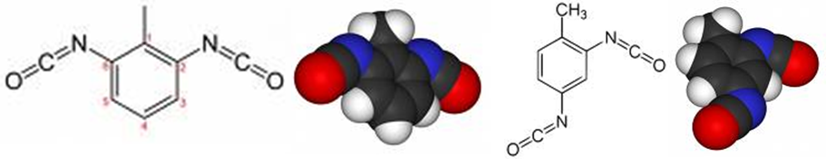 二异氰酸甲苯酯(toluene diisocyanate, TDI);化学式:CH3C6(NCO)2;分子量174.2。两种异构体:2,4和2,6-二异氰酸甲苯酯;商品多含80% 2,4-TDI和20% 2,6-TDI。常温常压下TDI乳白色液体或结晶,存放后浅黄色;强烈刺激性。不溶于水,溶于丙酮、乙醚、苯,四氯化碳等。