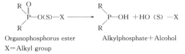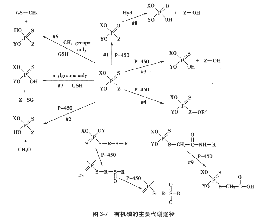 3.代谢:有机磷农药在体内的代谢途径及代谢速率因种属而异,并且取决于联结在其基本结构上的替代化学基团的种类。其通用的代谢反应式为: