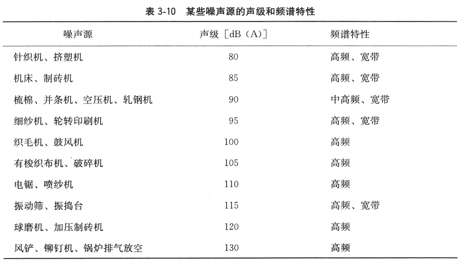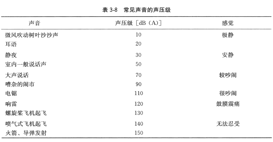 普通谈话声压级为60~70dB,载重汽车声压级为80~90dB,球磨机的声压级为120dB左右,喷气式飞机声压级为140~150dB,甚至更高(表3-8)。