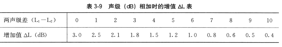 如果各声源声压级不同,将声源的声压级从大到小排列,按两两合成的方法逐一计算出合成后的声压级。先要计算出声压级的差值,从增值表(表3-9)中查出增值△L;较高声压值与△L之和即为合成后声压值L合=L1+△L。