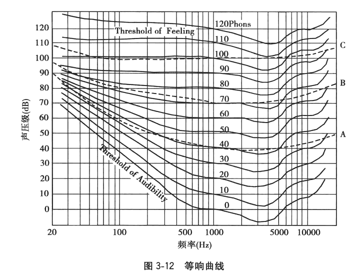 利用与基准音比较的方法,可得出听阈范围各种声频的响度级,将各个频率相同响度的数值用曲线连接,即绘出各种响度的等响曲线图(equal loudness curves,图3-12)。等响曲线中每条曲线给人的音响感觉是一样的。