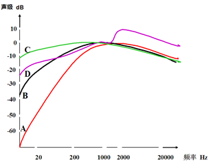 (2)声级:为了准确地评价噪声对人体的影响,在进行声音测量时,所使用的声级计是根据人耳对声音的感觉特性(模拟等响曲线),用不同类型的滤波器(计权网络)对不同频率声音进行叠加衰减。计权网络通常有“A”、“B”、“C”、“D”等几种。使用频率计权网络测得的声压级称为声级,声级单位也是分贝(dB)。根据滤波器的特点分别称为A声级、B声级、C声级或D声级,分别用dB(A)、dB(B)、dB(C)、dB(D)等表示。
