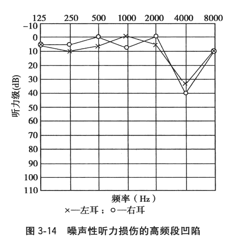 噪声所致的永久性听阈位移早期常表现为高频听力下降,听力曲线在3000~6 000 Hz(多在4 000 Hz)出现“V”形下陷(图3-14)又称听谷(tip)。随着接触噪声时间延长,病损程度加重,高频段听力下降明显,同时语言频段(500~2 000 Hz)听力也会受到影响,语言听力出现障碍,甚至出现噪声聋。